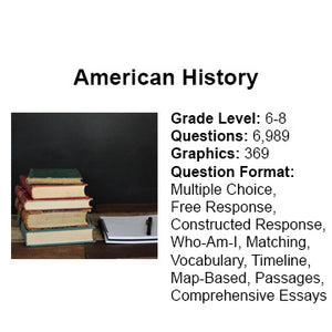 Examgen's Intermediate American History question bank contains nearly 7,000 questions and covers essential middle school broad social studies topics such as geography, civics, and culture. Questions pinpoint realms within those broad ideas like The Responsibilities of the Citizen and the Role of Religions during European Colonization. These questions also help teachers engage students to make connections from the broad to the concise and vice versa. You'll never again have to spend hours searching for political cartoons, maps, or timelines to include in questions; we provide a large variety of these for you in the question bank! The Intermediate American History product also includes essay questions at the end of every chapter for your students to work on their critical analysis and history essay writing skills. This product comes with the Examgen test generator, saving you a significant amount time in creating a variety of different tests, homework sheets, worksheets, quizzes, etc. quickly and easily.
